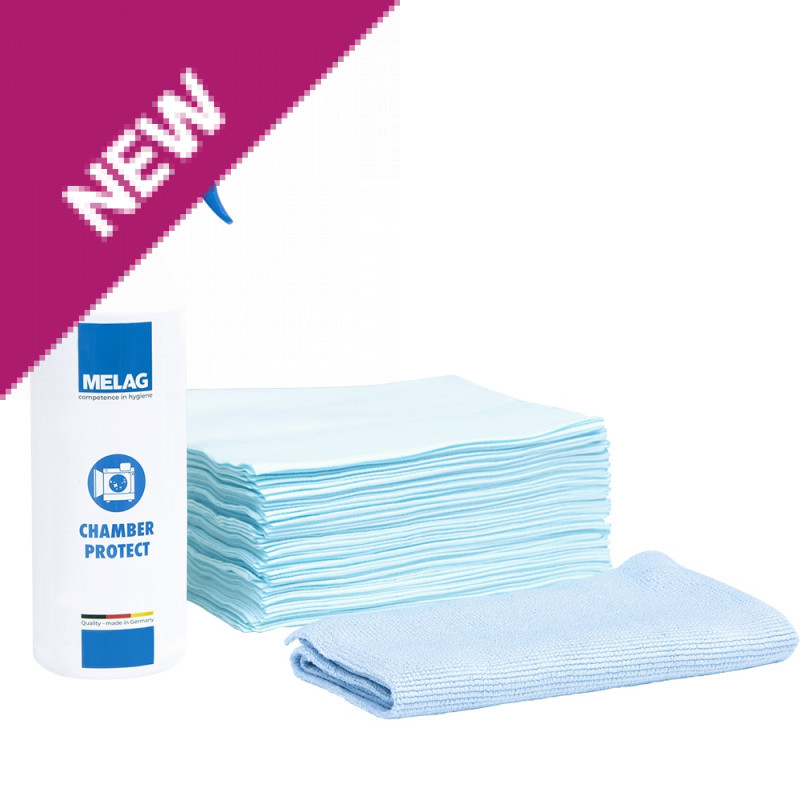 Pour des résultats de nettoyage idéaux, le kit de nettoyage Chamber Protect, incluant un détergent puissant et 50 chiffons non pelucheux et 1 chiffon microfibre, est parfaitement adapté à tous les autoclaves MELAG.
