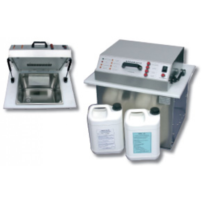 Chronologie du cycle : rinçage à eau claire, nettoyage par ultrasons avec PROCLEAN, rinçage eau claire sous ultrasons, rinçage avec le produit DPH21, séchage par air chaud avec filtre..