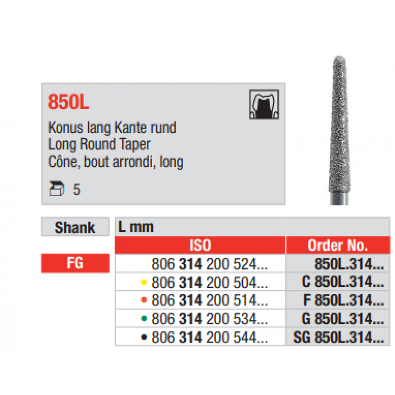 Fraise diamantée longue en forme conique à bout rond pour taile de moignon en congé. L’assortiment d’instruments diamantés d’Edenta vous offre des instruments universels pour de multiples utilisations – de la préparation de cavités, de moignons dentaires, de facettes jusqu’au traitement en Parodontologie. Le diamantage multi-couches d’Edenta pour une durée de vie élevée des instruments va aussi vous convaincre. Tout comme les instruments spécialement diamantés avec un revêtement de haute qualité – pour un travail sans échauffement et une performance de coupe très élevée. Qualité de fabrication suisse.