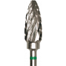 Fraise en carbure de tungstène de forme de flamme, à denture grosse et surtaillée.