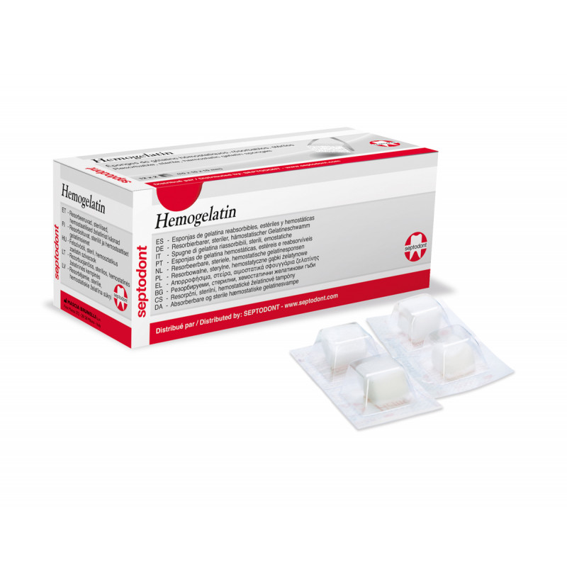Hemogelatin est une éponge de gélatine stérile d'origine animale, insoluble dans l'eau, facile à manipuler et résorbable. Elle est utilisée pour faciliter l'arrêt du saignement.