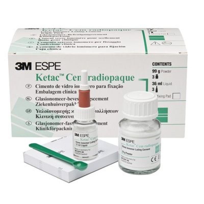 Ciment verre ionomère Ketac™ Cem, commercialisé depuis 1980, a prouvé son utilisation dans des millions de cas. Il a été le sujet de très longues études cliniques et a été souvent décrit dans la littérature comme la référence des scellements conventionnels. -Long recul clinique et large succès -Importante biocompatibilité -Ciment simple et pratique. CARACTERISTIQUES: La référence pour les scellements conventionnels. -Retrait des excès simple -Bonnes propriétés de scellement aux limites -Faible solubilité -Forte stabilité dimensionnelle -Propriétés auto-adhésives naturelles. INDICATIONS: -Scellement définitif d’inlays, d’onlays, de couronnes et de bridges - en métal ou céramo-métallique en céramique à base d’alumine ou de zircone (par exemple, couronnes et bridges Lava™) -Scellement par collage de tenons radiculaires et bagues d’orthodontie en métal -Fond de cavité