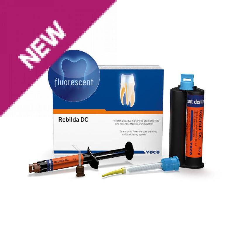 Le système bi-polymérisant de reconstitution de moignons et de scellement de pivots radiculaires à base de composite Rebilda DC fluorescent est le dernier venu de la gamme Rebilda. Bien établis sur le marché mondial depuis des décennies, les produits Rebilda sont considérées comme des valeurs sûres dans les cabinets dentaires en raison de leurs propriétés proches de la dentine. Outre les teintes dentine, blanc et bleu, il existe désormais aussi une variante fluorescente qui confirme une fois de plus la grande force d'innovation de VOCO.